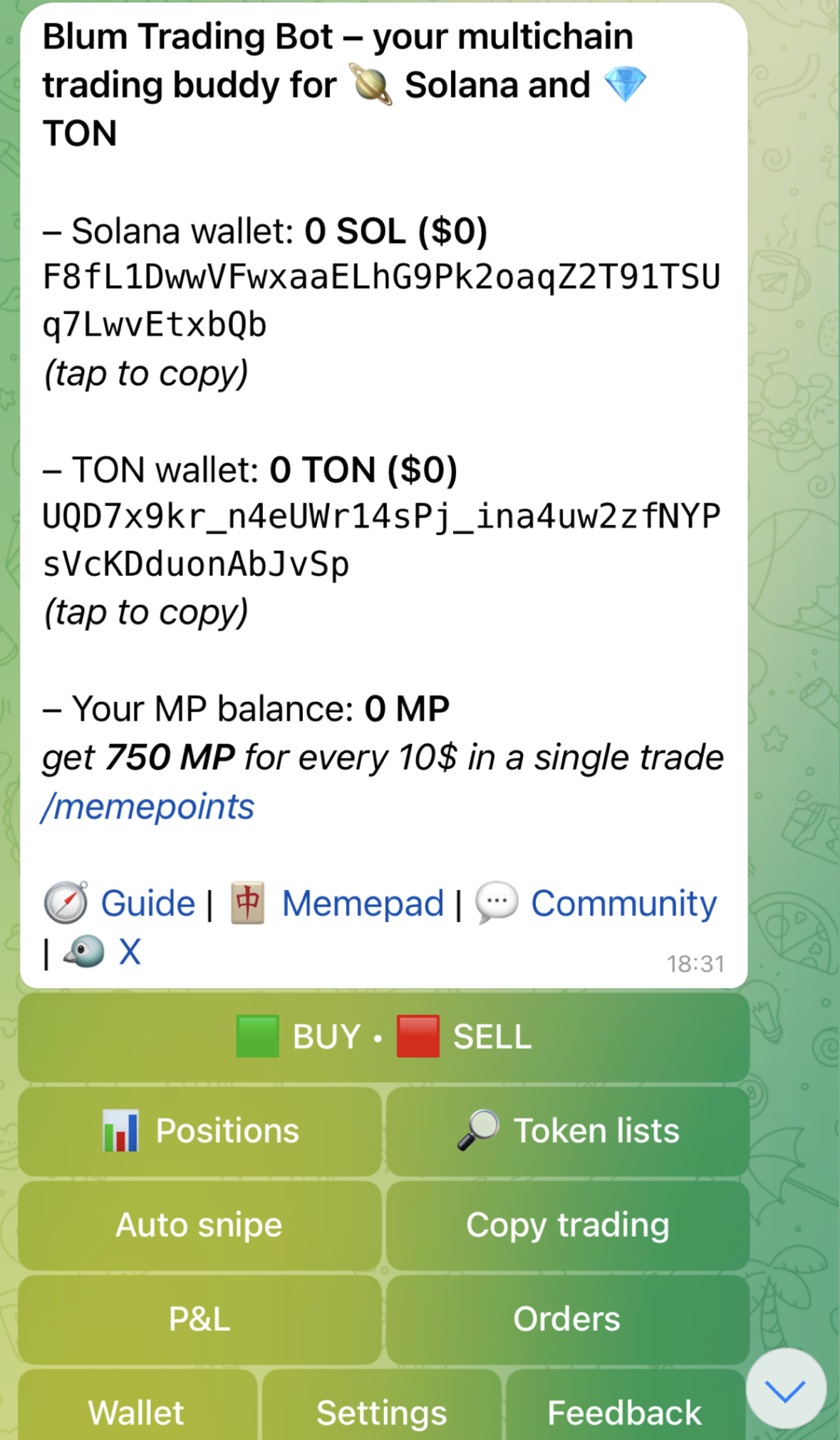 Para yatırıldıktan sonra cüzdanınız hazırdır. Artık Blum Trading Bot'u kullanarak keşfe çıkabilir ve işlem yapmaya başlayabilirsiniz🎉