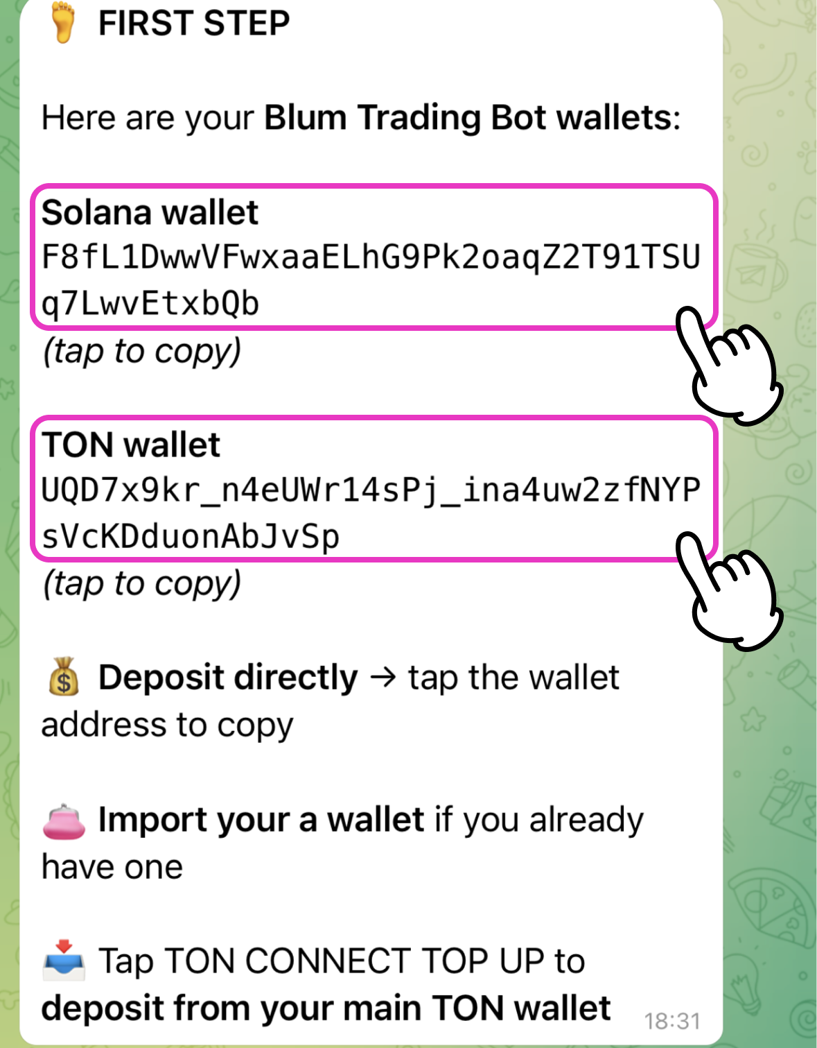 Başlangıç Şartlar ve Koşullar'ı kabul ettikten sonra Bot otomatik olarak yeni TON ve Solana cüzdan adreslerinizi oluşturacak ve sizinle paylaşacaktır.